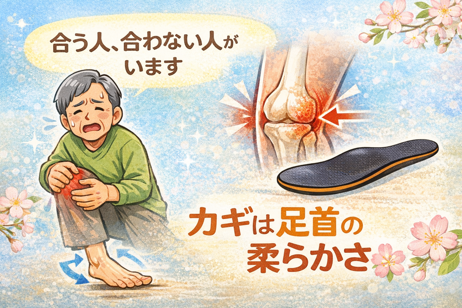 この流れが起きるためには、かかとの関節(距骨下関節)が外側にしっかり動ける柔軟性が必要です。足首が硬くて動きにくい人は、インソールを入れても重心が外側にずれず、膝への効果が生まれにくいのです。