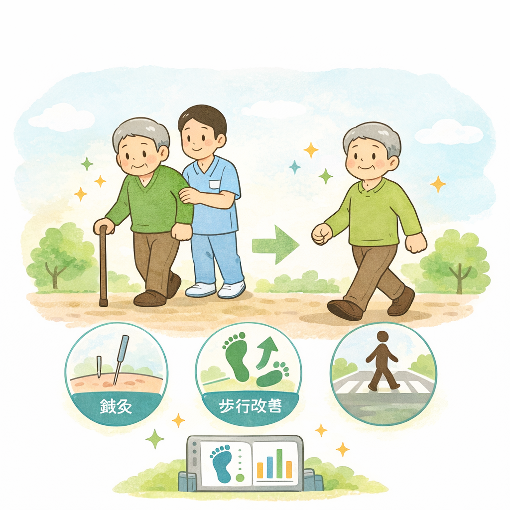 - 21件のRCT・1,463名を対象にした大規模解析で、鍼灸+リハビリ群はリハビリ単独群より歩幅・歩行速度・歩調など主要な歩行パラメータが有意に改善した。