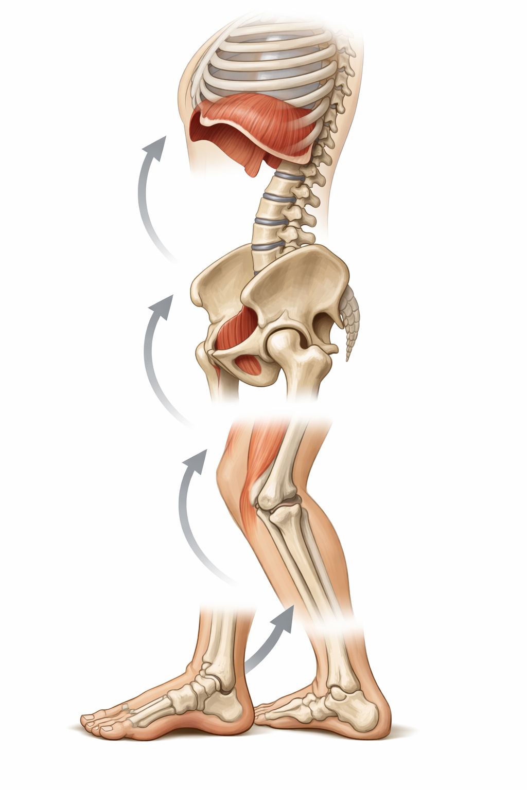 人間の身体は、骨・筋肉・関節がひとつの連鎖として機能しています。理学療法の分野では、これを「閉鎖運動連鎖(Closed Kinetic Chain)」と呼びます。足が地面に接している立位や歩行中、足首・膝・股関節・骨盤・脊椎はすべて力学的につながっており、ある部位の変化は上下の部位に波及します。