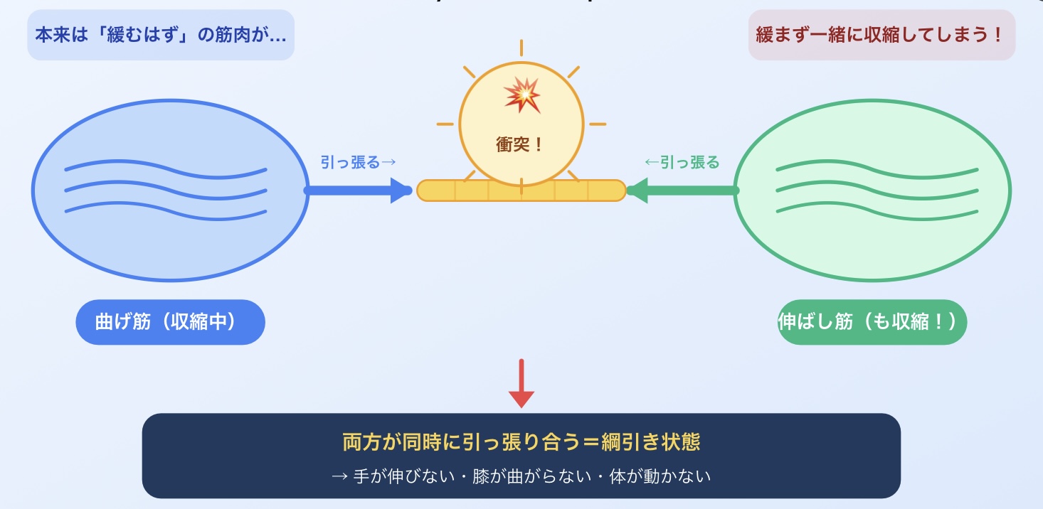医学的にはこれを Spastic movement disorder(痙性運動障害) と呼び、「筋肉が硬い」というより「動かそうとした瞬間に邪魔が入る」状態です。