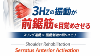 ## SEOタイトル(おすすめ)**前鋸筋を活性化する「3Hz振動」|スリング運動で肩の安定性を高めるリハビリ法**---## メタディスクリプション(検索結果用)前鋸筋がうまく使えないと、肩甲骨の動きが崩れ肩の痛みやインピンジメントの原因になります。本記事では、スリング運動に3Hzの振動刺激を加えることで前鋸筋を選択的に活性化する方法と、そのメカニズムや臨床応用についてわかりやすく解説します。